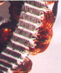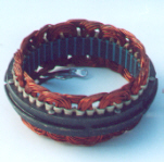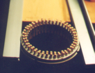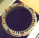 Support the stator core horizontally, at about table height, providing free access to the top and bottom. The raised ridges on the stator core help with jigging. The first phase winding takes the serpentine path shown by the black (oversized) wire. This is called a wave winding. Carefully examine the original stator windings and duplicate their size, location and general shape... Otherwise the new stator may not fit in the housing!