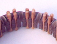 It is possible to remove the copper wire from the existing stator, and rewind the same core. However, re-manufactured bare cores are available for this alternator stator, and make the process much easier. Notice the paper insulation in the winding slots. The slot insulation should be tacked-in-place using 5 minute epoxy. To simplify winding it is helpful to install 3/16" diameter wooden pegs (1.5" long) into the slots as shown. The pegs create an excellent winding form for guiding the wire. The pegs are subsequently removed for winding the second, and third, phases.