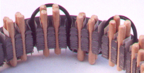 It is important to reserve space for the next two phases. The photo shows a typical first phase winding (pegs removed). The second and third phase windings are identical, except they are shifted over by one slot each. After winding, the coils can be secured in place with 5 minute epoxy. The slots are filled with silicone sealant to provide mechanical support and electrical insulation. The 3 starting leads are soldered together. The 3 end leads are fitted with ring eyelets, for attachment inside the alternator housing. This is called a "WYE" configuration.