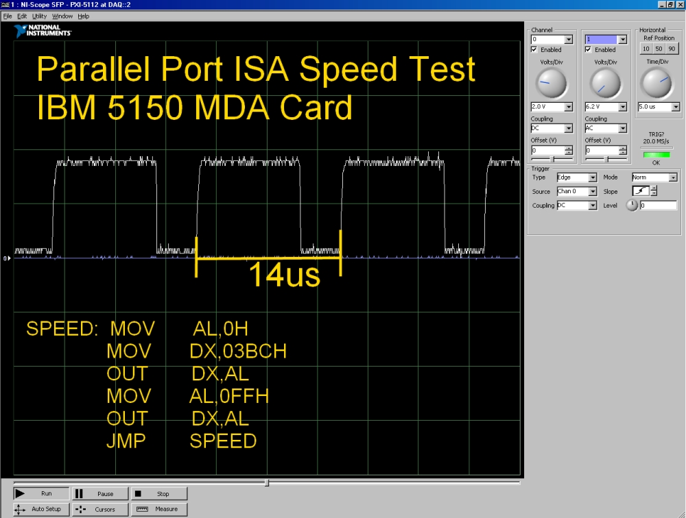 1) Programmed output on the parallet port on the MDA card. (Speed Test Results)